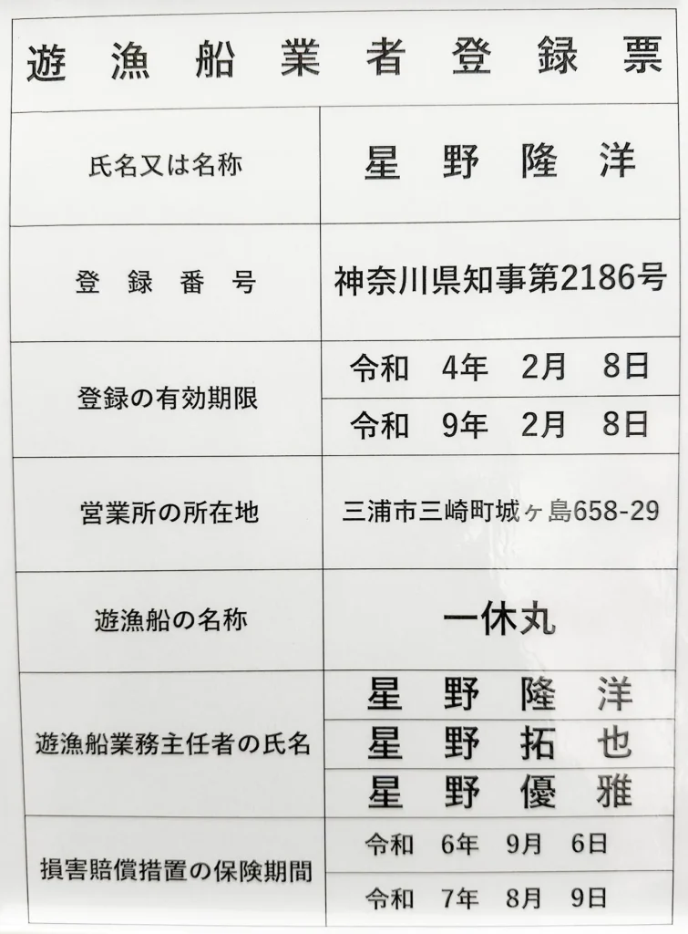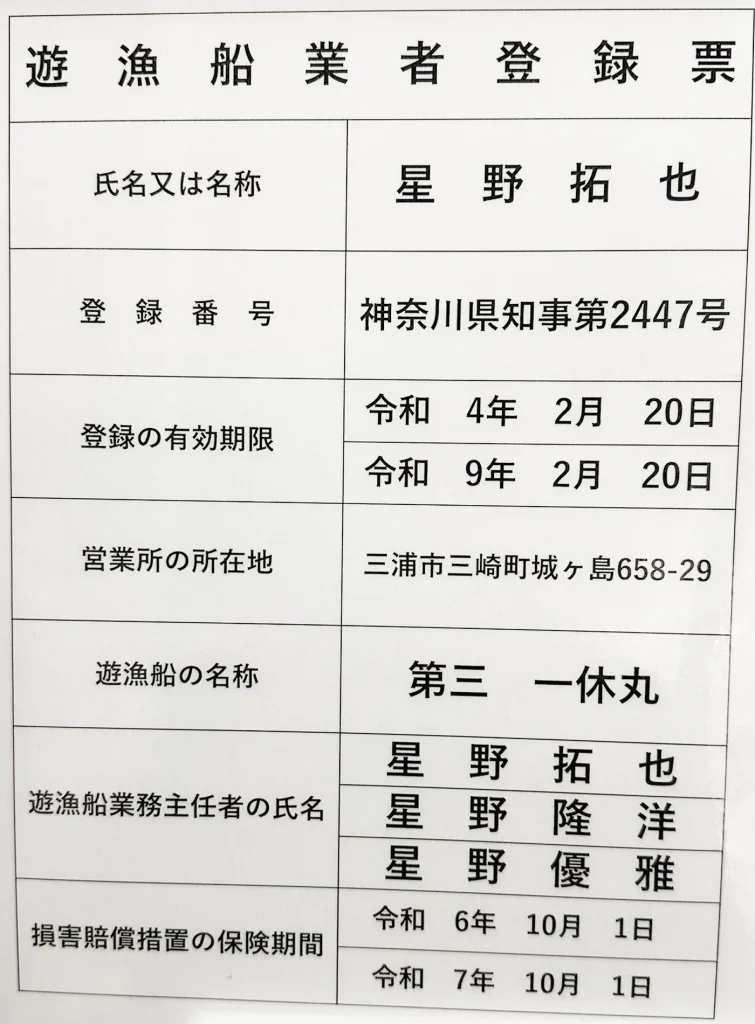 遊漁船業者登録票