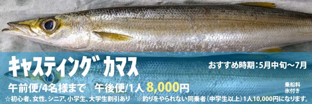 主に、漁船ですが釣り船の御予約がある場合には仕立て船でキャッスティング釣りでの出船。