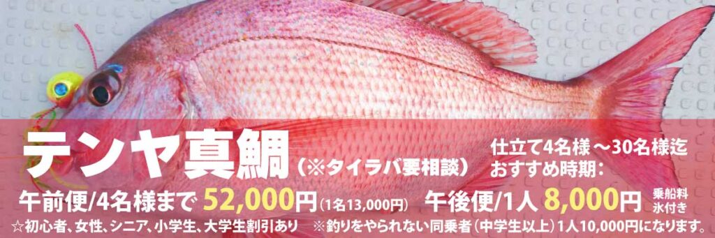 人気のあるターゲット、真鯛特有の三段引きの強い引きを味わってしまうとビギナーから上級者も真鯛釣りの虜に! 特に真鯛釣りの旬は4月、5月、6月で10kgを超える大型真鯛を釣り上げるチャンスあり!何人ものビギナーが5kg超えをゲットしています。