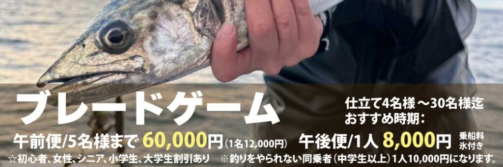 ※ 午前便の出船時間は、お客様のご都合に合わせてご自由に出船時間は決めていただけますが、釣行時間は短くなりますのでご理解とご協力の程宜しくお願いします。(基本:6-7時間の釣行となります)午後便のご予約が入っている場合もあります。